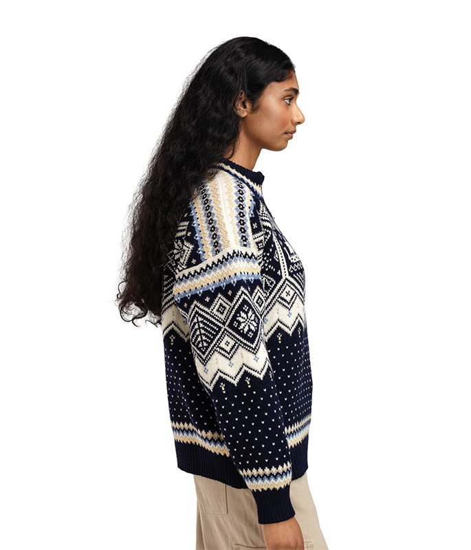 This is the official sweater for the 2025 Ski World Championships in Trondheim. A warm and comfortable wool sweater with a distinct retro touch, blending fresh colors with a classic expression. The pattern is inspired by the championship's values of diversity and inclusion, while drawing motifs from historical cultural landmarks in Trondheim. The sweater is knitted in 100% wool for long-lasting qualities and features a medium-high neck with a zipper.