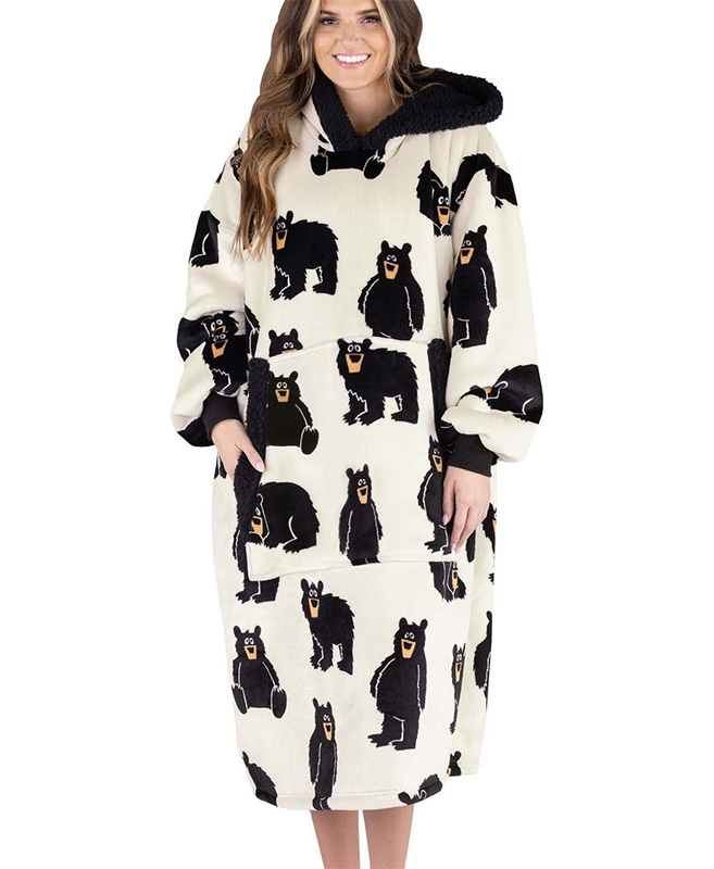Our Family Bear collection gets even bigger with our Family Bear Blanket hoodie. Featuring our overall classic black bear design on a comfy blanket hoodie. Our blanket hoodies are a cute over sized hoodie that is one size fits all. Making it the perfect gift for anyone! Our Blanket Hoodies are made with 100% super soft coral fleece, making them perfect for snuggling on the couch on a cold day. They also feature big kangaroo pockets perfect for those late night snacks!