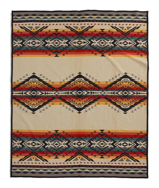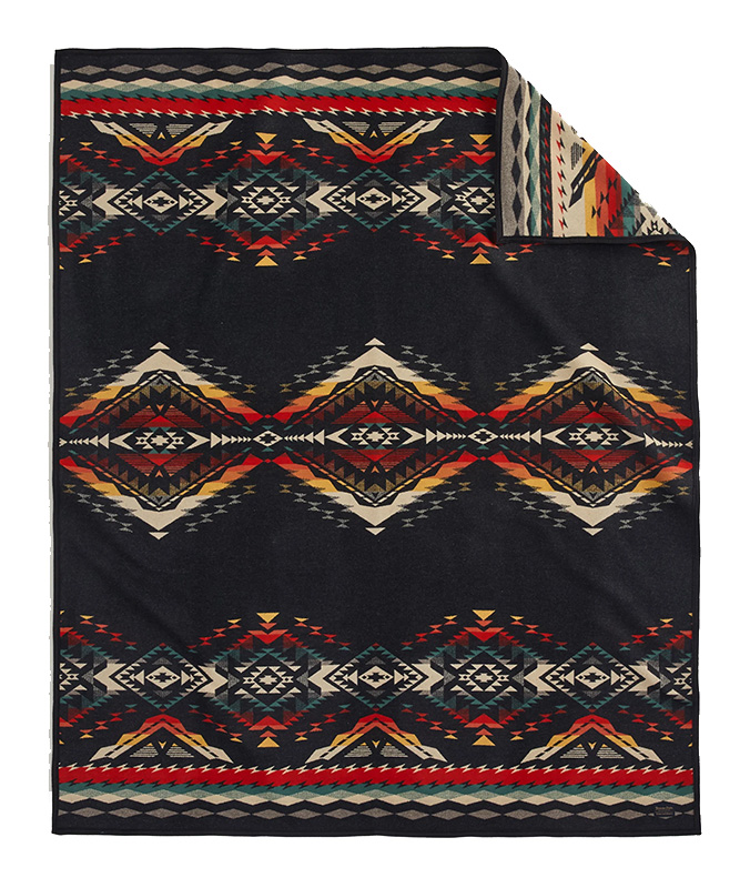A made-in-USA wool blanket with a centered motif representing Bridge Creek, a sometimes calm, sometimes tempestuous, waterway running through Mitchell, Oregon. This tiny town once held a thriving business district; today, Mitchell welcomes travelers to the John Day Fossil Beds and the Painted Hills. In this pattern, layers of diamonds and zigzags represent colorful, complex hills of the area's dramatic geology.