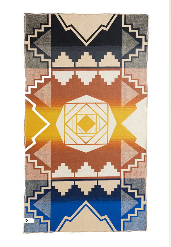 The plight of homeless veterans inspired Troy Tso (Diné) to consider the meaning of home. His design's center is a Hogan, a traditional Diné structure of wood and earth. The roof's construction - shown from the inside looking up - is surrounded by the four mountains that bound the Navajo Nation: Dibé Ntsaa (Hesperus Peak), Sisnaajini (Blanca Peak), Tsoodzil (Mount Taylor), and Dook'o'oosliid (the San Francisco Peaks).
