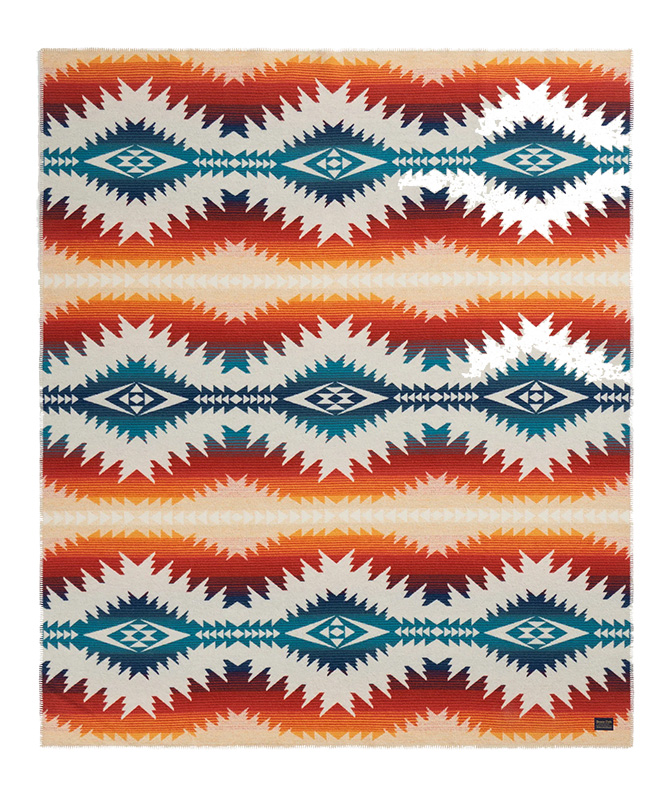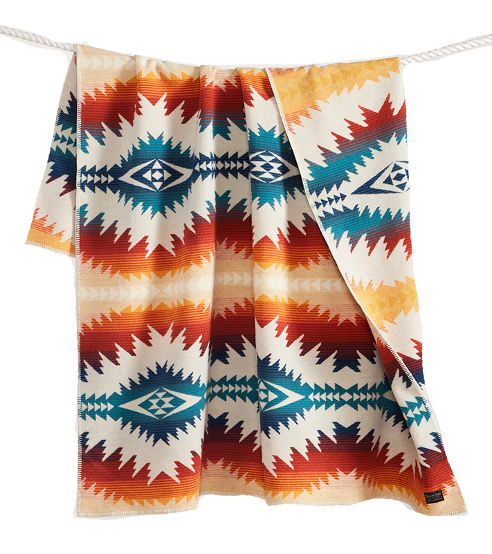 Winds are strong and elevation is high on the road through Utah's Sunset Pass. This wool blanket pattern shows the Dirty Devil River flowing through canyons carved over millions of years. The river is surrounded by plateau walls, with colorful striations telling the story of a layered landscape that transformed from swamp to desert over time. Today, Sunset Pass offers spectacular canyon views.