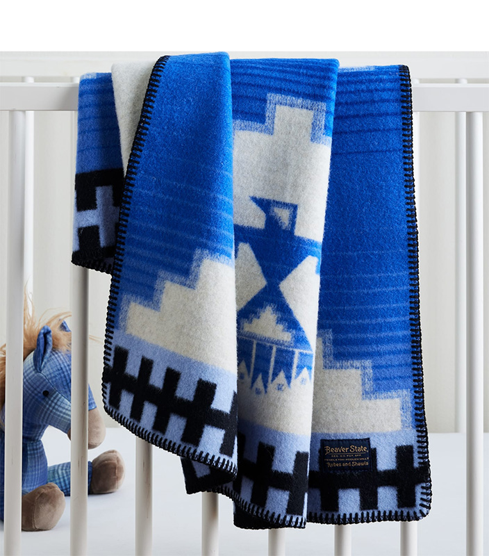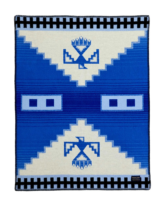 In 1865, a young beader created this design for her own moccasins and leggings. Generations later, Cydnee Shangreaux has translated her fourth great-grandmother's pattern to tell the Morning Storm story. Two borders of Morning Stars represent a long life with many winters. Steps represent a journey, with the two dots on either side signifying a good life from childhood to adulthood. Thunderbirds serve as messengers along the way, carrying songs through the storm.
