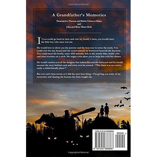 Hines revisits the games he and his sisters played and describes the chores he tried to avoid. He celebrates the simple joys found in a shady meadow or a mound of newly mowed hay and warns readers about the dangers found during any expedition to the deep woods or to the nearby barn. His world is filled with wild and not-so-wild animals and all are potential playmates. He lives during a time when neighbors gather as a community to thresh a crop of wheat and celebrate the harvest with feasts of fried chicken, biscuits, roast beef, cake and coffee – lots of cake and coffee.