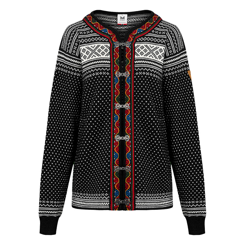 The authentic Dale of Norway look! The Setesdal design evokes history and memories; it is the most recognized Norwegian pattern and has been knitted for generations. The small v-shaped dots are known as the “lusekofta” (lice pattern), while the crosses were believed to protect from evil spirits. Details include authentic pewter clasps and an embroidered band that is identical to the original design that has been used for centuries, all made in Norway. This is a unisex style sweater. If purchasing for a woman, we suggest going down a size for optimum fit.