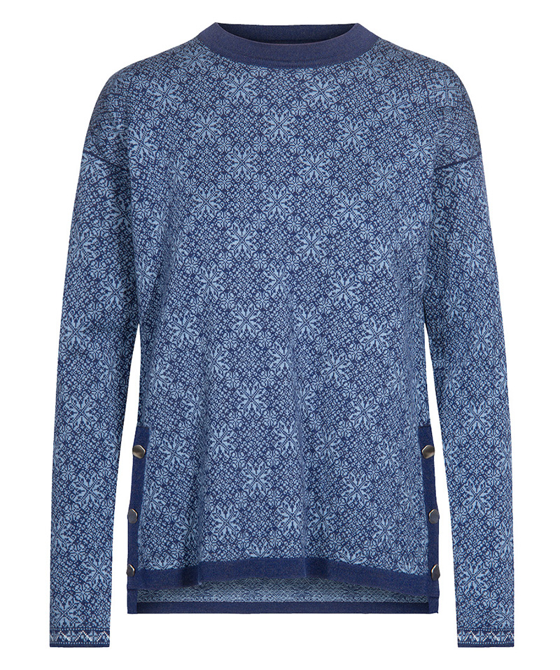 A feminine sweater with flattering button closure side slits at the hips and a roomy fit. It is a light and delicate sweater made from 100% skin-soft merino wool. The detailed pattern is a modern take on the traditional Norwegian look. The name ‘Symra’ comes from the Norse word ‘symre’ which means ‘summer’. Fittingly the Symra sweater is covered with flowers.
