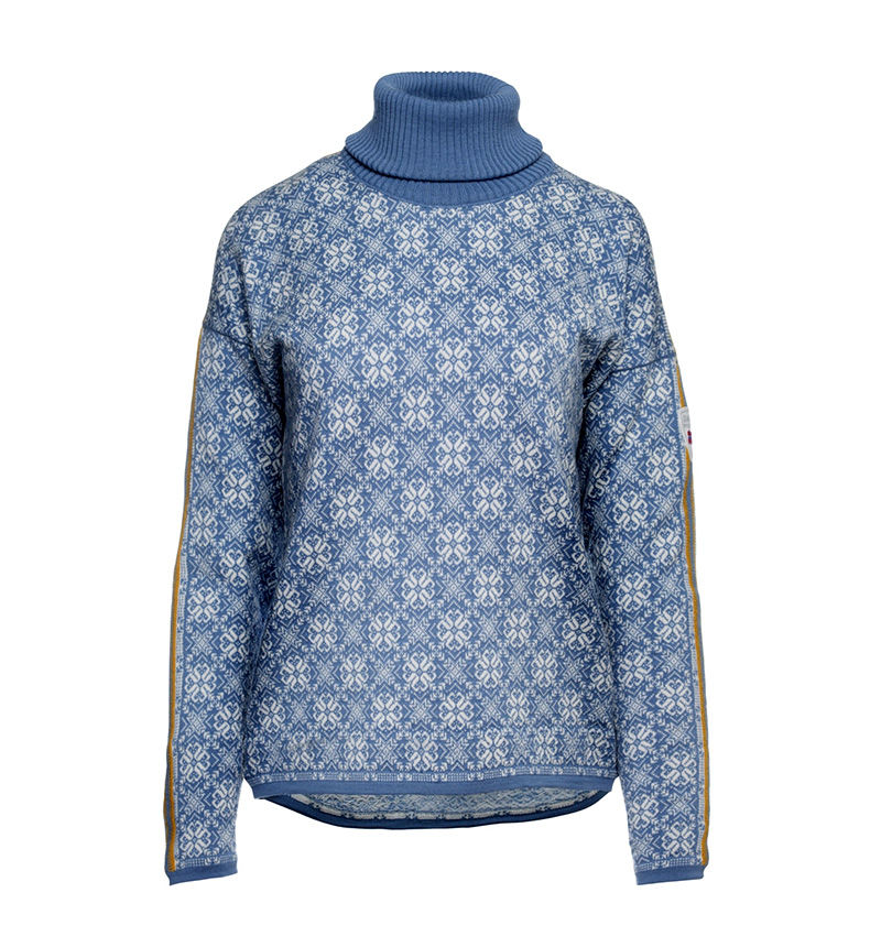 This is a remake of our sporty Frida jacket: A relaxed turtleneck sweater with a young and wide fit – the same fit as our highly popular Bjorøy sweater – with shorter front and slightly longer back. The pattern remains unchanged, with a softened, round-edged version of the eight-petal rose repeated across the sweater.