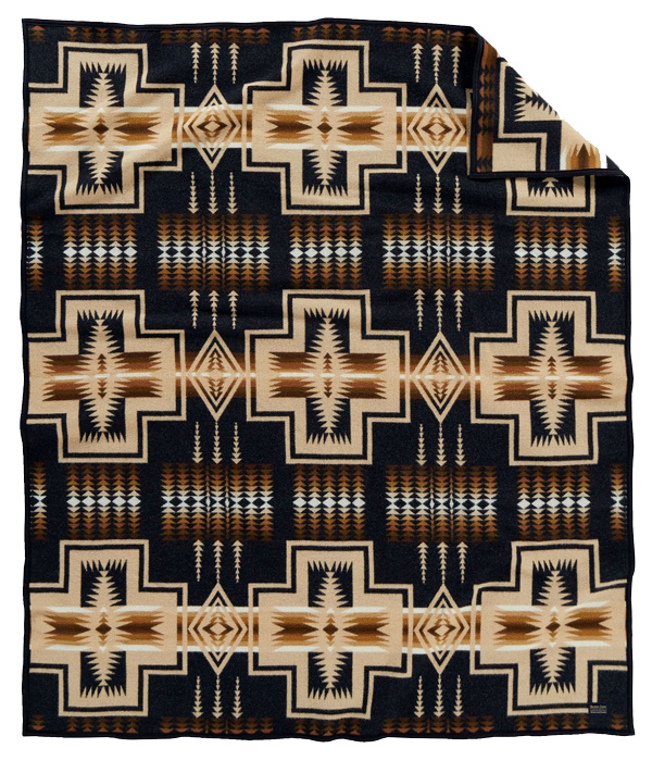 Robe, felt binding Size: 64" x 80" Shawl, 4" Fringe edge. Size: 68" X 68" In 1923 President Harding and his wife visited the West to dedicate a portion of the Old Oregon Trail. At that ceremony, local Cayuse and Umatilla chiefs presented the First Lady with a Pendleton shawl inspired by the already famous Chief Joseph blanket. These shawls are impressive as wall hangings and practical when folded on a sofa or at the foot of a bed.