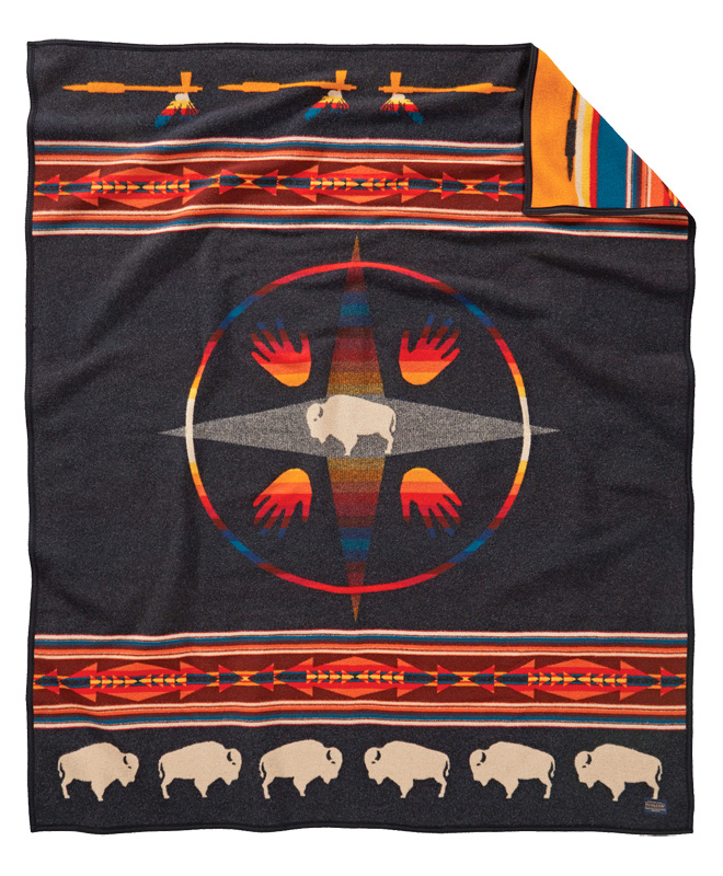 The rare white bison occurs only once in every 10 million births. In 1933, a white buffalo was born in the wild on Montana’s Flathead Indian Reservation and was called “Big Medicine” to reflect his sacred power. Many Native American tribes consider the return of the White Buffalo the fulfillment of an ancient prophecy and the beginning of a new era for the peoples and Mother Earth. Tradition spoke of the coming of a herd of pure White Buffalo. The seven bison on this blanket represent the seven directions: North, South, East, West, Above, Below and Within. Together they symbolize wholeness for mankind and the earth. Prayer pipes signify mankind's communication with the Creator. In the center of the blanket, within the circle of life, are four hands representing the diverse peoples of the world and a new beginning. Shades of brown and green reflect the natural beauty of Mother Earth.