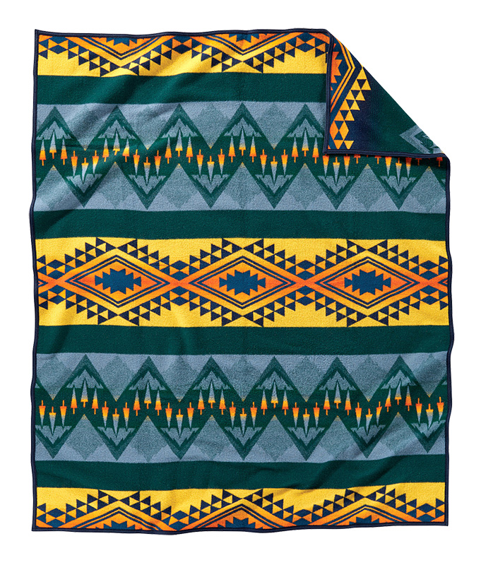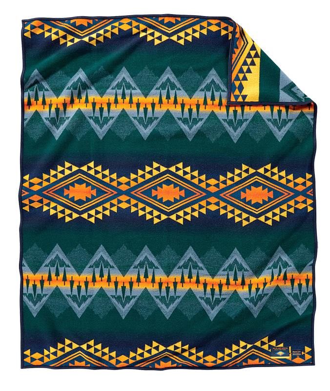In this tribute to our nation’s wildland firefighters, bands of deep forest alternate with lines of flame. A portion of sales from this wool blanket helps to support the Wildland Firefighter Foundation, in aid of injured firefighters and their families. 18% cotton. Made in the USA. Napped, Felt binding. Dry Clean.