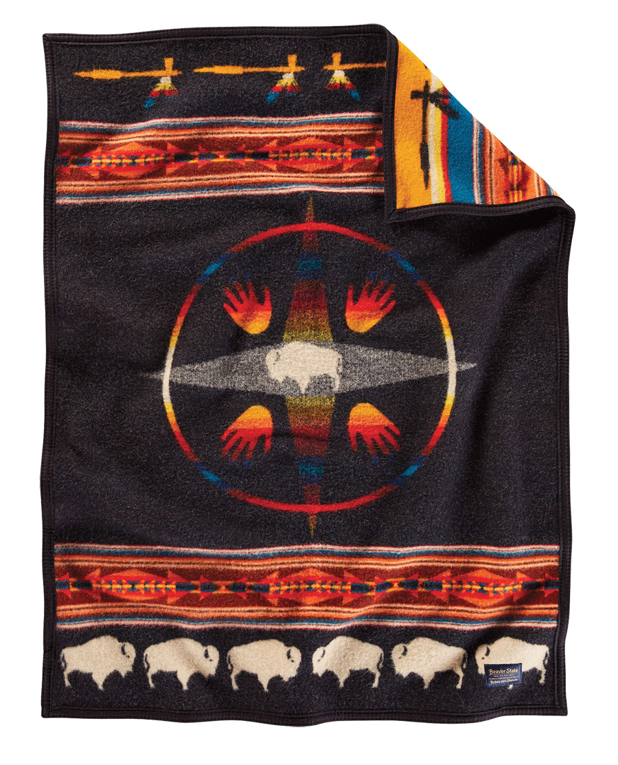 Tuck them in and tell a story with a soft wool baby blanket made in America. A circle of life contains four hands representing new beginnings and the diverse peoples of the world. Seven bison evoke the seven directions, which together symbolize wholeness for mankind and the earth. Dry Clean. 82% pure virgin wool/ 18% cotton. Made in the USA. Felt bound.