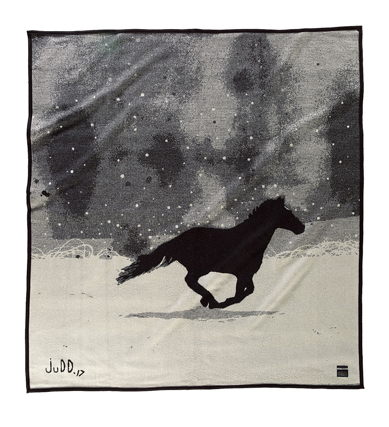 Pendleton works with artists to bring their work-paintings, prints, murals and more-to the loom in a series dedicated to American artistry. In "A Horse Called Paint," a dark horse gallops, silhouetted against a snowy night, The original painting is by Montana artist Judd Thompson, who uses his passion for color theory in a variety of media including painting and sculpture. Dry Clean. 82% wool. 18% cotton. Made in the USA. Unnapped, felt binding.