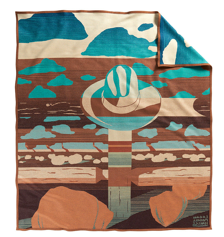By Logan Maxwell Hagege A well-worn hat on a split-rail fence offers a moment of respite for the rider who hung it there. Logan Maxwell Hagege is a Los Angeles-based contemporary artist whose modern visions of the American West use repeating shapes to create a visual narrative for each composition. Dry clean. 82% pure virgin wool, 18% cotton.