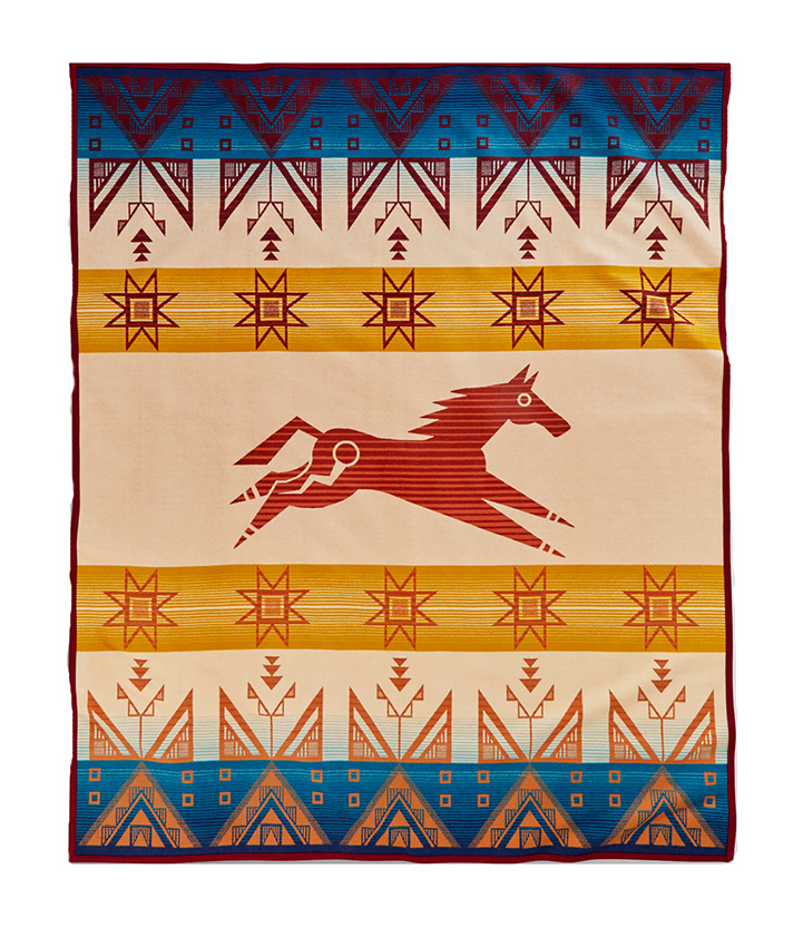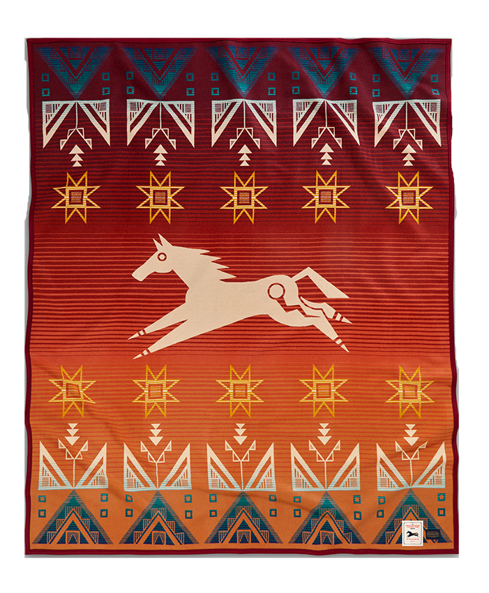 In this blanket pattern, a horse gallops through a Lakota village of traditional tepees at sunrise, while a geometric Morning Sun greets the dawn over each dwelling. The Lakota word for horse is Sunka Wakan or "Holy Dog," a symbol that stands for strength and unity. This wool blanket was designed by Native American artist by Chelysa Owens-Cyr, and is crafted from start to finish at our Pendleton, Oregon, mill, for quality you can count on.