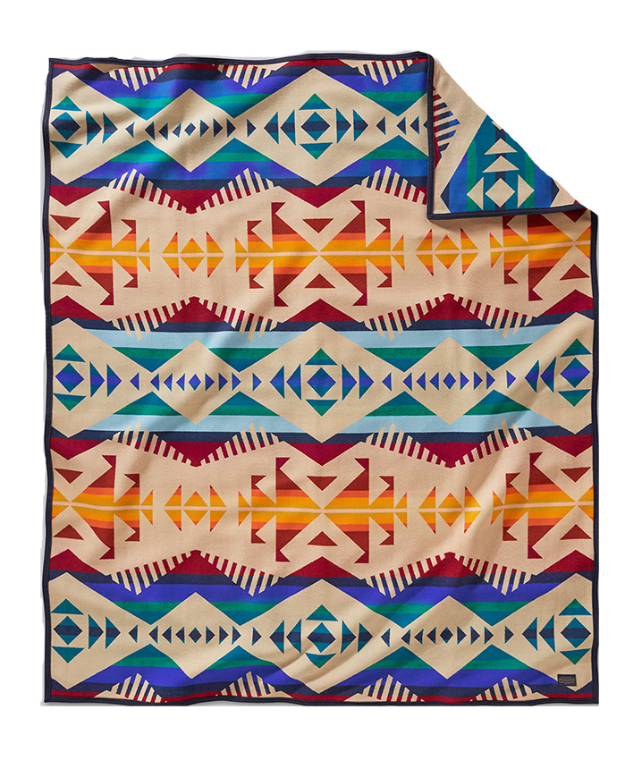 This USA-made wool blanket features multi-directional arrows symbolizing the routes of people who made petroglyphs—carvings on rock walls—to record their specific cultures and journeys through the area now known as Los Lunas. This small New Mexico town is a neighbor to Laguna Pueblo, the Rio Grande Valley, and Hidden Mountain. The area's abundant petroglyphs include figures seen nowhere else in the Americas.