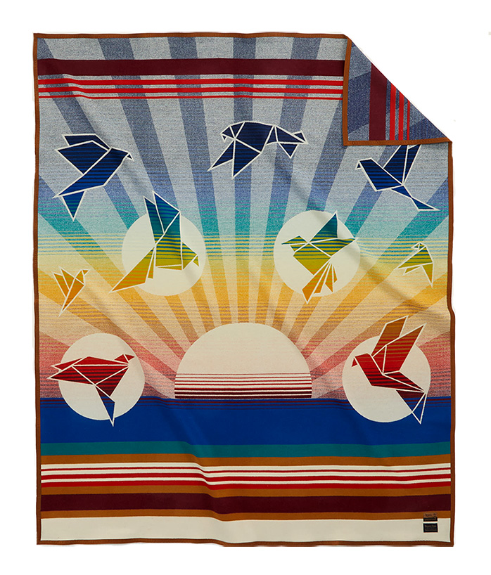 Against the blue of Father Sky, songbirds rise from Mother Earth to greet the healing rays of Morning Sun. The birds carry messages of harmony, renewal and balance in a design that brings awareness to the Missing and Murdered Indigenous Peoples Movement. A band of turquoise symbolizes Life, with bands of red for missing Native relatives who will never be forgotten. Designed by Diné artist Lenadra Yazzie, this blanket is woven from pure virgin wool in our Pendleton, Oregon, mill.