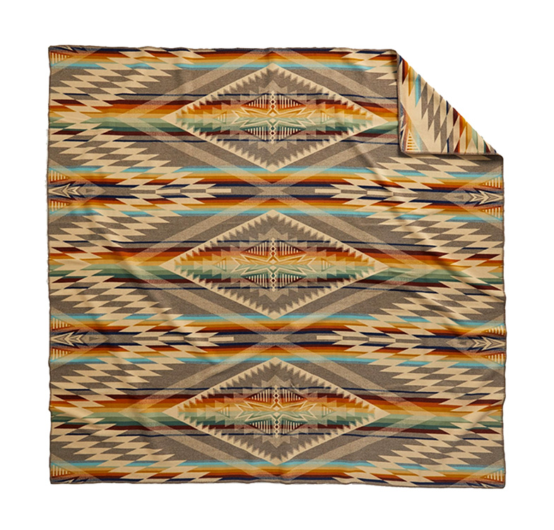 This colorful pattern was inspired by the Summerland Trail in Mt. Rainier National Park, voted Best Wildflower Spot in the USA by 1889 Magazine. Vibrant bands of color capture the wildflowers, waterfalls and mountain views within the park. Crafted from pure virgin wool/cotton, the reversible jacquard has two distinct looks.