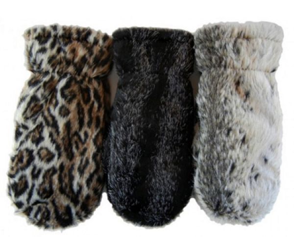 Mittens have a faux animal outer fabric and a 300 weight fleece lining with elastic at the wrist for a comfortable warm fit.
