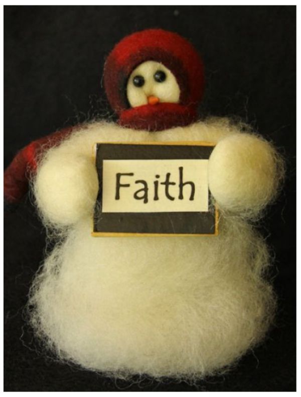 This Wooly® Primitive Snowman has Faith in his friends and family of the winter wilderness. This collectible snowman figurine makes a unique gift for friends and family, and it is the perfect addition to your own snowman collection for winter décor. All Wooly® Primitive Snowman decorations are made of 100% wool and handcrafted in the USA.