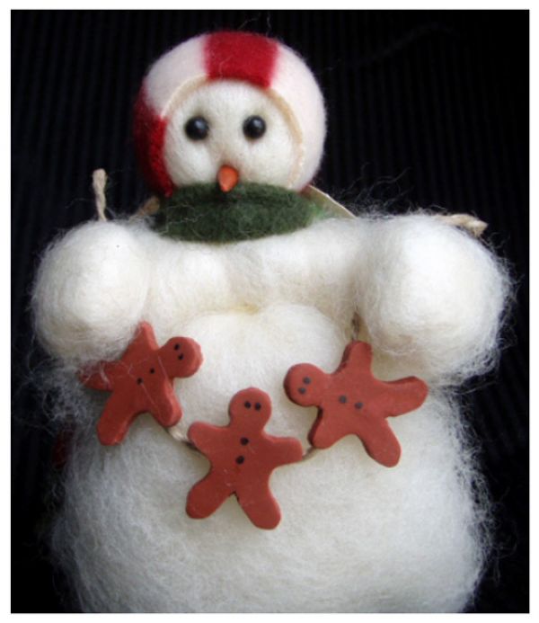 As the holiday season approaches, Wooly snowman is busy decorating hearth and home. The snowman figurine carefully strings gingerbread men and searches for the perfect spot for these delightful decorations. This collectible snowman figurine makes a unique gift for friends and family, and it is the perfect addition to your own snowman collection or winter décor. All Wooly snowman decorations are made of 100% wool and handcrafted in the United States.